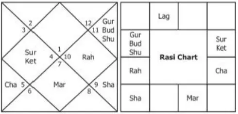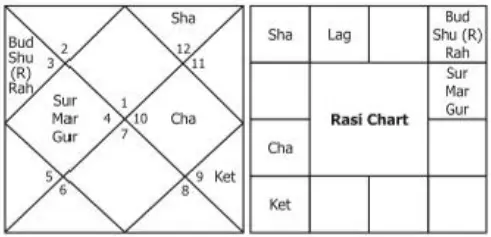 Budha, Guru and Shukra are in the 6th and the 7th houses from the Moon and they are not combust. They are not spoiled by malefic planets especially they are not eclipsed by Rahu or Ketu. He is sure to come up very well and reach very high positions in life.” The chart is as follows: