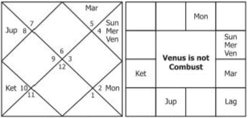 In a certain female horoscope (Chart No. 2) Mercury and Venus are very well combined in Lagna, as lords of 10 (and 1) and 9 (and 2) respectively. But, Venus, the lord of 9 the house of luck and good fortune, is rather weak, in combustion, for, though the combustion of
