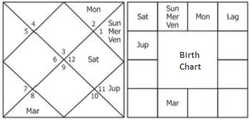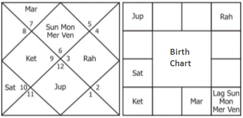 But, it is unable to mar the Yoga, though it reduces the grade of success and reputation and in the Dasa of Mars, his rise was obstructed. The native is a very intelligent and brilliant I.C.S. and was connoisseur of music and delayedly elevated from a District Judgeship as a High Court Judge only in the Dasa of Rahu, whose fag-end however may mark his life’s end, too, as Mars aspects Rahu also.