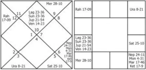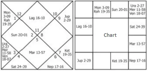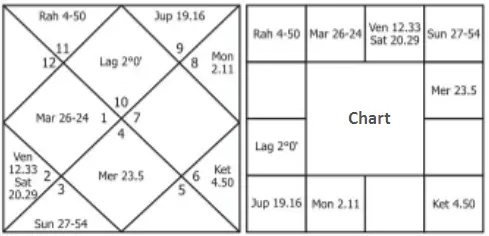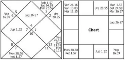 The lagna is Leo (Simha) which is owned by Sun. Also, it is necessary to note the asterism in which the lagna has fallen. Lagna is in the last portion of the star Poorvapalguni (otherwise called Pooram), which is governed by Venus-Sukra.