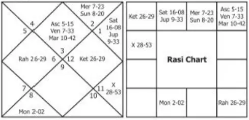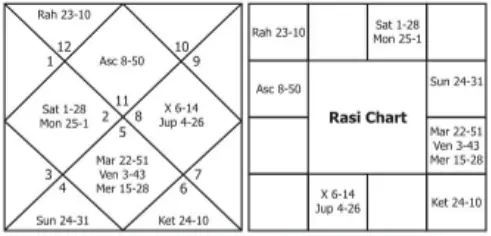 From a horoscope, it may not be possible to delineate the native of his birth whether he will be born in poor or rich or royal families. This is evident from Brihat Jataka which says when dealing with Raja Yogas that if the Yogas are effective, a man born in poverty will become a king and a person born in rich families will become an emperor. The above proposition makes it clear that it is difficult to predict the nature of the family in which a person takes his birth. Now we shall take a few horoscopes and see how far these Yogas are effective in the light of the Dasas the natives may enjoy.