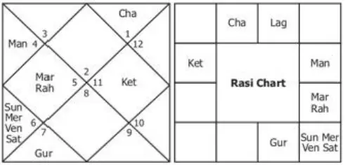 In this horoscope all the 7 planets (other than Rahu and Ketu) are in 4 houses namely the 12th house, the 4th house, the 5th house and the 6th house from the ascendant and in the 5th house, the 6th house and the 7th house from Chandra.