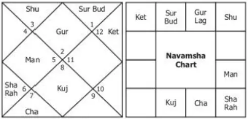 In the Navamsa chart Guru occupies lagna Navamsa and Sani occupies vargottama Navamsa. The Sun is exalted in the 12th place from Navamsa lagna which it shares with Budha – Surya and Chandra are in Sama Saptma navamsas. The lord of the 7th Navamsa house, Kuja, is in its own Navamsa. Kuja is in shashtashtama with Shukra and in Argla with Chandra.