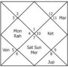 Here, Jupiter the 9th lord is aspecting Moon ruling the mind and thus native studied law. Mercury, the 6th lord is also in Libra with Jupiter and Sun. All these factors show a career connected with law.